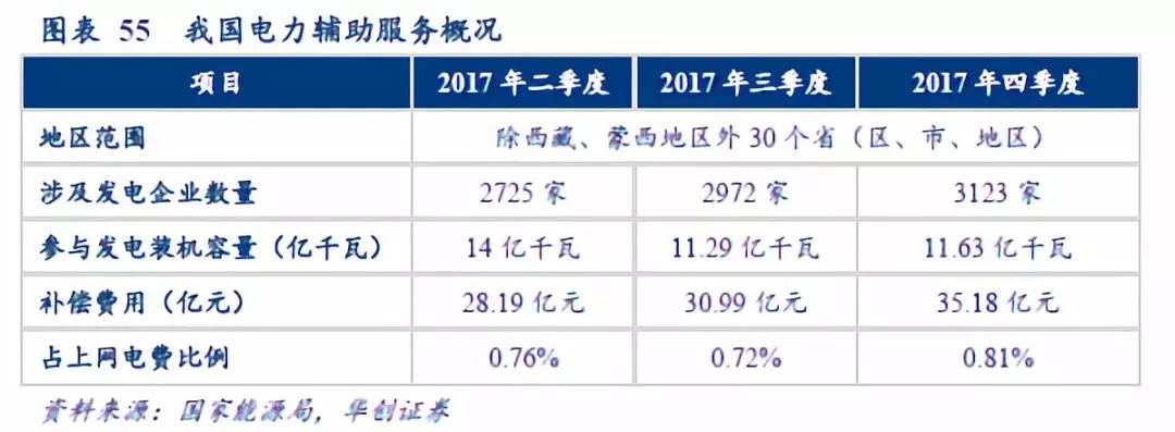 2017年11月開始,國家能源局先后公布了2017年第二、第三、第四季度的全國輔助服務(wù)補償情況通報,除西藏、蒙西地區(qū)外的30個省均已建立起了電力輔助服務(wù)機制。補償費用在上網(wǎng)電費比例達到了0.7~0.8%左右,我們估計目前全國每年的電力輔助服務(wù)補償費用在110~125億元之間。