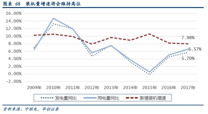 首先,我國用電量正在進入一輪經(jīng)濟增長疊加電能替代帶動下的快速增長通道,未來三年的負荷增速在7.5%以上。同時,電網(wǎng)最大負荷也將以6%~8%左右的增速保持增長,裝機需求仍然較大。考慮到風電、光伏的平均負荷率較火電低40%以上,同等用電量下的裝機量將遠高于火電裝機。整體來看,我國未來三年將保持120GW左右年均新增發(fā)電裝機量。而考慮到配額制的約束,新能源年均新增裝機量也將有望保持70GW左右的水平。
