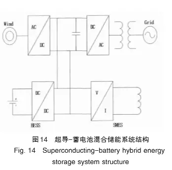 目前研究較多的SMES混合儲(chǔ)能主要是超導(dǎo)-蓄電池混合儲(chǔ)能。超導(dǎo)-蓄電池混合儲(chǔ)能是將SMES與電池儲(chǔ)能系統(tǒng)(batteryenergystoragesystem,BESS)相結(jié)合的一種混合儲(chǔ)能裝置。它采用共直流母線的結(jié)構(gòu),風(fēng)機(jī)通過(guò)變流器和變壓器連接到電網(wǎng),SMES和BESS通過(guò)各自的DC/DC斬波器連接到直流母線上(圖14)。