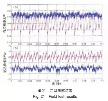 圖20是有功平滑的實(shí)驗(yàn)結(jié)果。在實(shí)驗(yàn)過(guò)程中,非線性負(fù)載的功率由50kW跳變到100kW后跳變回50kW。在負(fù)荷突增時(shí),儲(chǔ)能線圈的電流從300A下降到260A,從而為突增的負(fù)荷提供突變的有功功率;而在負(fù)荷突降時(shí),儲(chǔ)能線圈從電網(wǎng)吸收有功功率,儲(chǔ)能線圈的電流逐漸增加到300A。在負(fù)荷突增或者突降時(shí),電網(wǎng)電流的幅值沒(méi)有明顯變化,這表明負(fù)荷突變對(duì)電網(wǎng)的沖擊大大減輕,有效地實(shí)現(xiàn)了有功平滑的功能。