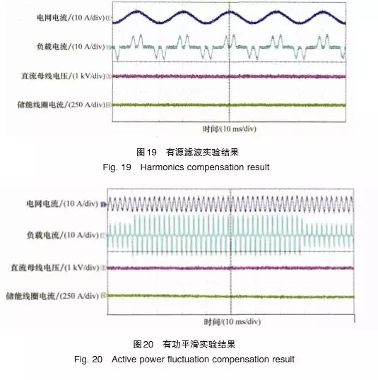 為了評(píng)估該SMES的性能,對(duì)其進(jìn)行了實(shí)驗(yàn)和并網(wǎng)測(cè)試。圖19是其有源濾波的實(shí)驗(yàn)波形,自上至下依次為電網(wǎng)電流、負(fù)載電流、直流母線電壓和儲(chǔ)能線圈電流。