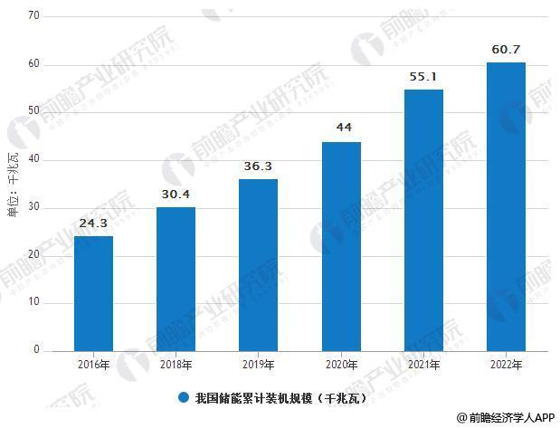 2016年,我國儲能累計裝機規(guī)模為24.3千兆瓦,同比增長4.7%。預計到2018年我國儲能累計裝機規(guī)模將達到30.4千兆瓦,未來五年(2018-2022)年均復合增長率約為18.82%,2022年裝機規(guī)模將達到60.7千兆瓦。