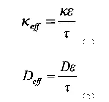 孔隙率和迂曲度對(duì)電極中的鋰離子電導(dǎo)率和電解液擴(kuò)散有重要影響,多孔電極中液相的傳導(dǎo)和擴(kuò)散能力除與電解液本征特性(電導(dǎo)率κ、擴(kuò)散系數(shù)D和鋰離子遷移數(shù)t+0)有關(guān)外,還受電極中的多孔結(jié)構(gòu)影響,常用孔隙率ε與迂曲度τ計(jì)算。