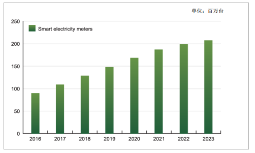 歐盟要求其成員國(guó)在 2022 年前要將電表全部更換為智能電表,在各國(guó)政府的推動(dòng)下,智能電表安裝數(shù)量自 2009 年開始呈現(xiàn)大幅增長(zhǎng)的態(tài)勢(shì);預(yù)計(jì)到 2030年,歐洲需要為電網(wǎng)升級(jí)改造投入約 5,000 億歐元。除丹麥、芬蘭和挪威等國(guó)的智能電表已逐步發(fā)展成型外,英國(guó)、法國(guó)、西班牙以及葡萄牙等國(guó)為滿足歐盟的能源發(fā)展目標(biāo)和環(huán)境政策要求,也制定出大規(guī)模智能電表市場(chǎng)的發(fā)展規(guī)劃。至 2023 年歐洲智能電表安裝總量累計(jì)將超過 2 億臺(tái),較2016 年的不足 1 億臺(tái)翻了一番多。歐洲智能電表市場(chǎng)即將進(jìn)入繁榮期,并通過再生能源和智能電網(wǎng)的雙重實(shí)施實(shí)現(xiàn)其“20-20-20”(能源使用效率上升 20%、二氧化碳排放減少 20%以及可再生能源使用達(dá)到 20%)的耗能目標(biāo)。