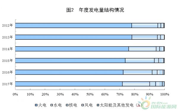 2017年,全國發(fā)電量6.5萬億千瓦時(shí),比上年增長(zhǎng)5.9%。其中,火電增長(zhǎng)5.1%,水電增長(zhǎng)0.5%,核電增長(zhǎng)16.3%,風(fēng)電增長(zhǎng)24.4%,太陽能發(fā)電增長(zhǎng)57.1%。
