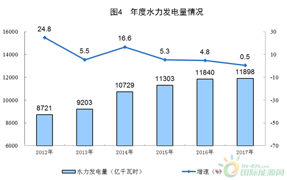 2017年,水力發(fā)電量11898億千瓦時(shí),比上年增長(zhǎng)0.5%;與2012年相比,水力發(fā)電量增加3177億千瓦時(shí),年均增長(zhǎng)6.4%。2017年水電增速放緩主要是受降水量大幅下降、來水差影響,2016年平均降水量730毫米,為歷史最多,2017年僅為641毫米。