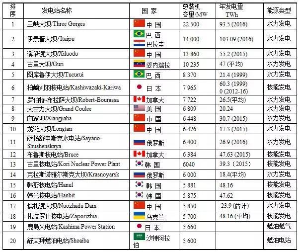 在世界上前20位發(fā)電站中,中國水力發(fā)電占有5席,均為水力發(fā)電。世界上最大的20座發(fā)電站每年都有所變動,加拿大羅伯特-布拉薩大壩從原有的第17位沖到第7位;韓國古里核電站發(fā)展壓水反應(yīng)堆也沖入第13位,超過本國的韓蔚核電站和韓光核電站。另外值得注意的是燃煤發(fā)電和燃?xì)獍l(fā)電已經(jīng)踢出前20強(qiáng)了。水力發(fā)電和核能發(fā)電均屬清潔能源發(fā)電,獨霸前20強(qiáng),化石燃料發(fā)電的地位逐步降低。