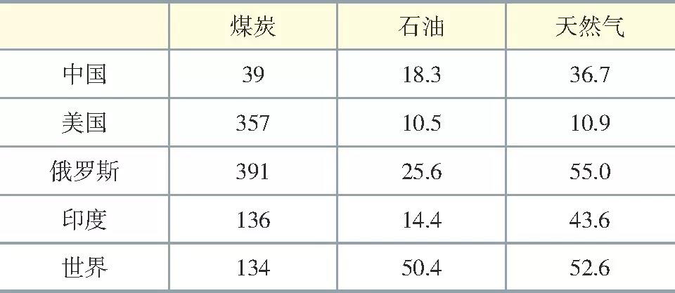 傳統(tǒng)化石能源儲量有限是影響我國能源安全的一個主要因素。根據(jù)BP的統(tǒng)計(jì)數(shù)據(jù),截止到2017年底,我國煤炭的儲采比僅為39,低于世界平均水平的134、印度的136、美國的357和俄羅斯的391。而受石油產(chǎn)量下降的影響,2017年我國石油儲采比雖然增加至18.3,但仍遠(yuǎn)低于世界平均水平50.4。天然氣儲采比增加至36.7,高于美國的10.9,約為世界平均水平的70%,見表1。