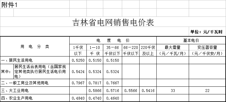 附件:1.吉林省電網(wǎng)銷售電價表