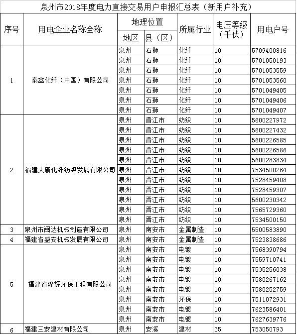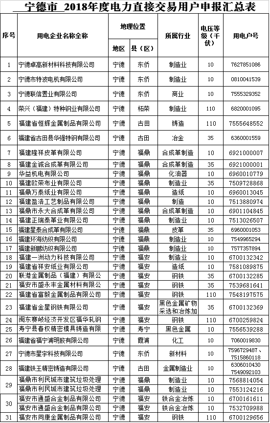 福建省經(jīng)信委分別于3月23日、26日發(fā)布了《關(guān)于2018年度電力直接交易新用戶名單的公示》及補(bǔ)充公示名單。兩批次共604家新用戶。在3月23日公