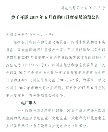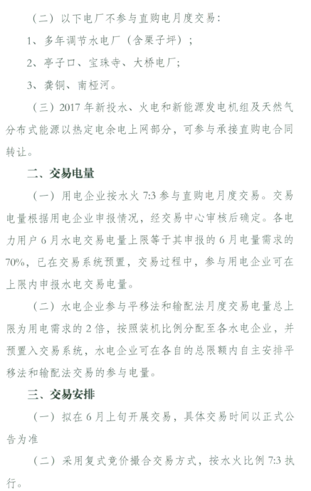 四川電力交易中心發(fā)布了《關(guān)于開展2017年6月直購(gòu)電月度交易的預(yù)公告》。按照公告上所示,此次交易方式雖說(shuō)采用的是復(fù)式競(jìng)價(jià)撮合交易方式,但交易過(guò)程卻是極為燒腦的復(fù)雜三段式交易方式,交易過(guò)程劃分為“集中競(jìng)價(jià)、雙掛雙摘、火電匹配”三個(gè)階段。交易電量為用電企業(yè)按水火7:3參與直購(gòu)電月度交易。另外,公告中明確標(biāo)列出有些發(fā)電企業(yè)將不參與到此次交易中。