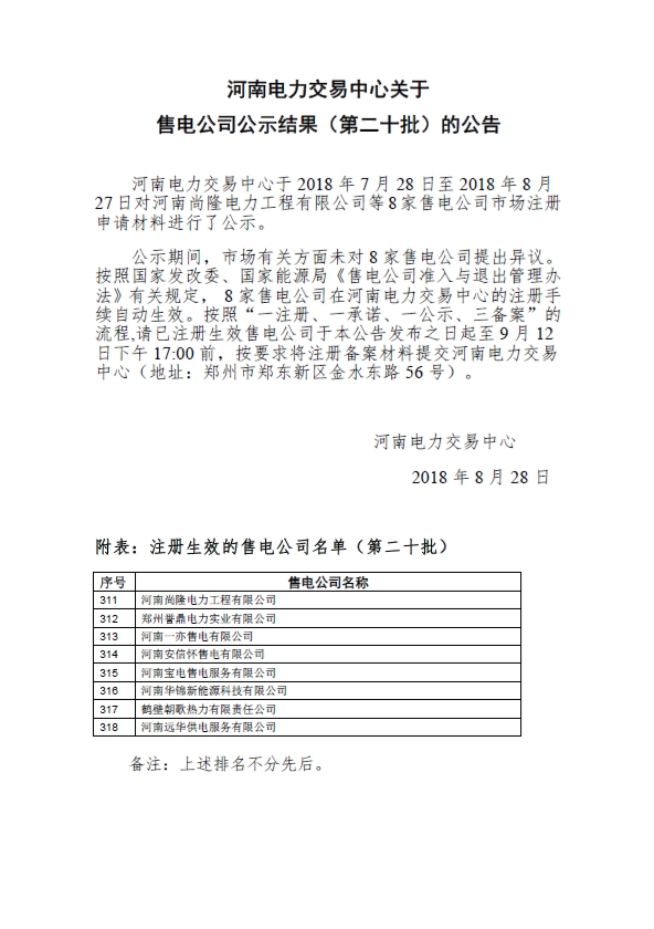 河南售電公司公示結(jié)果(第二十批):8家售電公司注冊生效