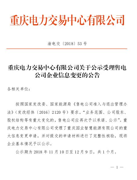 重慶電力交易中心日前發(fā)布了《關(guān)于公示受理售電公司企業(yè)信息變更的公告》,公示1家申請(qǐng)注冊(cè)信息變更的售電公司,公示期為2018年11月10日至12月9日,共一個(gè)月。
