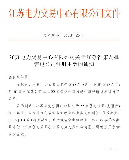 江蘇電力交易中心日前發(fā)布了《關(guān)于江蘇省第九批售電公司注冊(cè)生效的通知》,江蘇電力交易中心有限公司于2018年9月11日至2018年10月10日對(duì)江蘇省第九批22家售電公司市場(chǎng)注冊(cè)申請(qǐng)材料進(jìn)行了公示,公示期間市場(chǎng)有關(guān)方面未提出異議,22家售電公司注冊(cè)手續(xù)自動(dòng)生效。