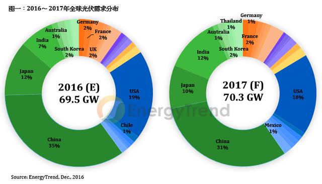 印度及新興市場的成長幅度未能彌補中、美、日的需求衰退,一線組件廠為鞏固出貨,其2017年報價頻破底,預估組件市場均價將由2017年初的US$ 0.38/W,跌至年底的US$0.33/W,不僅中上游廠商將面臨極大虧損,一線組件廠也難維持過去15%以上的毛利區(qū)間。整體而言,2017年光伏供應(yīng)鏈由上至下利潤都將低于2016年水平。