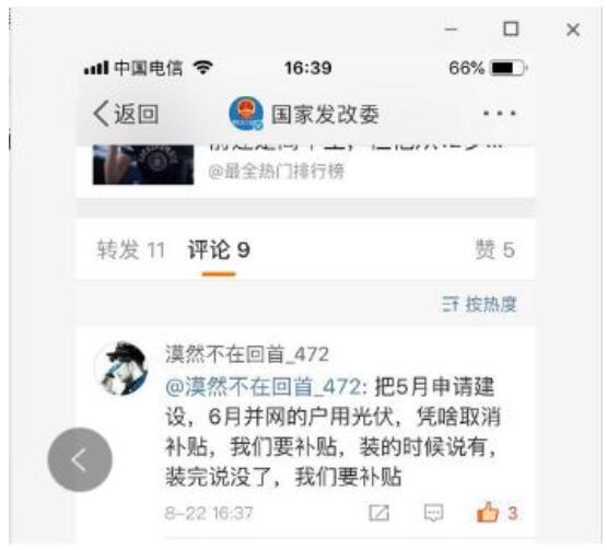 531新政已發(fā)布近三個月,5月31日至6月30日之間并網(wǎng)的戶用光伏電站是否能得到補貼仍未有政策落實,久候政策不至,深陷各種糾紛的戶用光伏經(jīng)銷商無法安心等下去,在撥打相關政府部門的電話均未得到明確反饋后,一些經(jīng)銷商開始選擇在政府機構的微博賬號下留言。