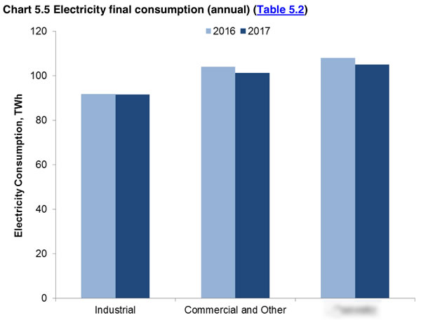 2017年英國(guó)電力消費(fèi)為3500億千瓦時(shí),比2016年(3570億千瓦時(shí))下降1.8%。英國(guó)電力需求下降的原因主要是氣候溫和(比2016年平均氣溫高出0.3攝氏度)以及能源利用效率的改善。2016年居民用電量為1051億千瓦時(shí)(比2016年下降2.6%),工業(yè)部門用電915億千瓦時(shí)(比2016年下降0.3%),商業(yè)部門及交通部門用電量1014千瓦時(shí)(比2016年下降2.5%)。