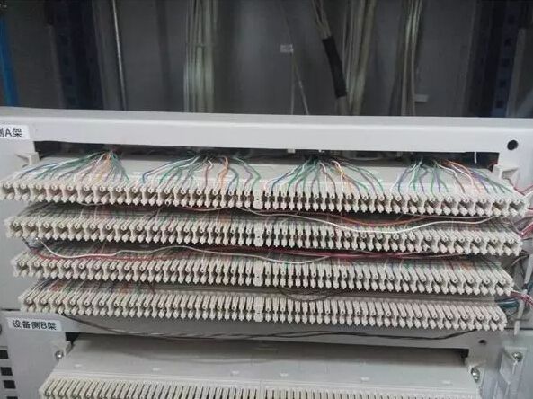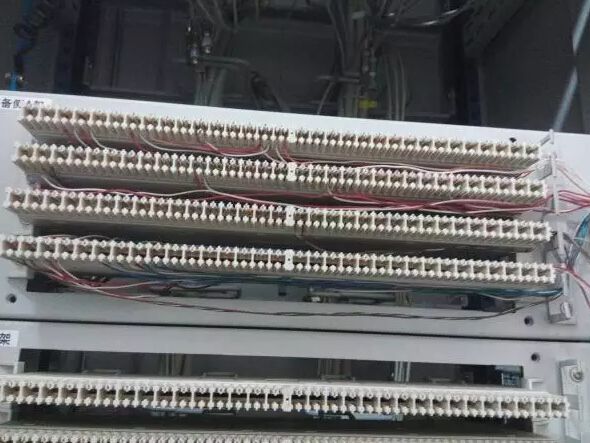 如上圖所示,第一排下口零散分布的一對一對線,則是通向站內(nèi)的自動化設(shè)備,視通信方式的制定而選擇接入對應(yīng)的端子。用戶側(cè)常見設(shè)備:自動化所用的調(diào)度、集控主備用設(shè)備、站內(nèi)電話、計(jì)量電話、調(diào)度直通和集控直通電話。一般情況下,現(xiàn)場工作是將站內(nèi)所有的用戶設(shè)備通過一根網(wǎng)線或是多股電纜傳送至VDF,并在VDF的一排打滿,然后再通過音頻線跳接至相應(yīng)的端口。以前有些老站也是通過端子排掛到綜合配線柜上再跳接的辦法。具體如何接線,視現(xiàn)場條件和運(yùn)行方式的規(guī)定而調(diào)整。