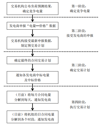 交易機構(gòu)制定合同電量市場交易計劃,并通知各發(fā)電商(機組)在合同電量市場中每個月的中標電量和中標價格(或各個時段的出力),隨后簽訂正式合同。