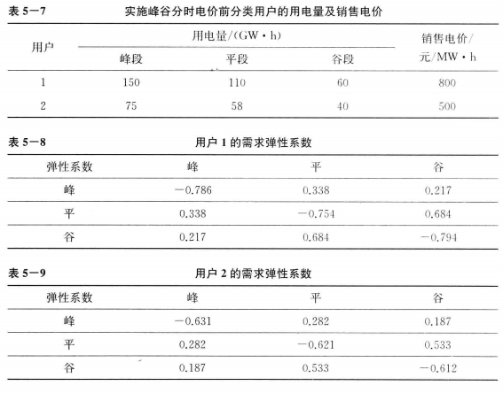 (1)基礎(chǔ)數(shù)據(jù)。這里算例叁考①中的數(shù)據(jù)。用戶側(cè)共有兩類用戶執(zhí)行峰谷分時(shí)電價(jià),實(shí)施峰谷分時(shí)電價(jià)前某一時(shí)期內(nèi)的電量需求及銷售電價(jià)如表5-7所示,兩類用戶的需求彈性分別如表5-8、表5-9所示。