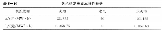 發(fā)電側(cè)共有火電、水電和小火電三個(gè)機(jī)組,每個(gè)機(jī)組的發(fā)電成本特性曲線系數(shù)如表5 -10所示。