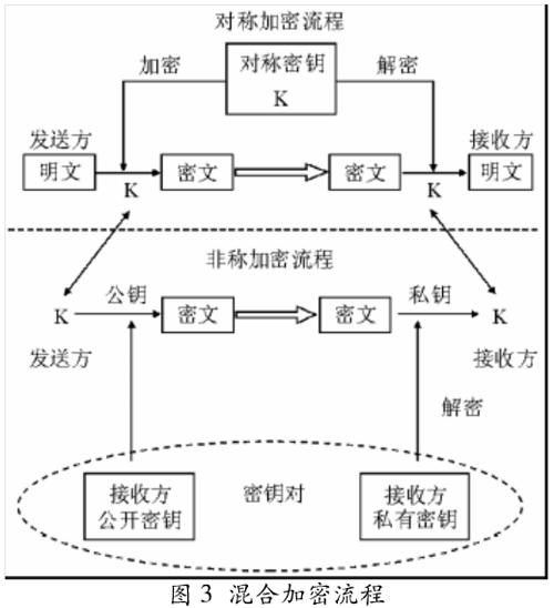 混合加密技術(shù)不是一種單一的加密技術(shù),而是一個(gè)結(jié)合體,是上述兩種數(shù)據(jù)加密技術(shù)相互結(jié)合的產(chǎn)物。通信雙方的通信過程分為兩個(gè)部分,雙方先利用非對(duì)稱加密技術(shù)傳送本次通信所用的對(duì)稱密鑰,然后再用對(duì)稱加密技術(shù)加密傳送文件。混合加密流程如圖3所示。
