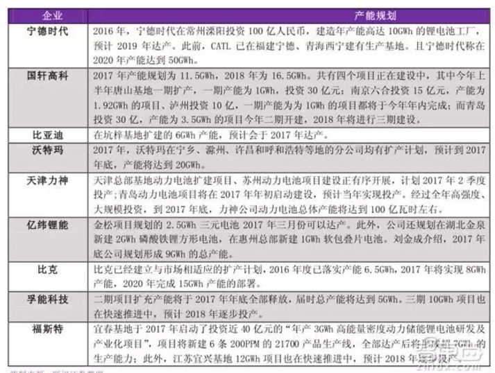 部分企業(yè)動力電池產(chǎn)能擴張規(guī)劃