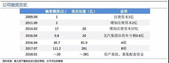 據(jù)了解,成立于2009年的北汽新能源發(fā)展迅猛,是連續(xù)五年的純電動汽車銷量龍頭。其中,2015-2017年北汽新能源銷量實(shí)現(xiàn)每年翻番,比如2017年其純電動銷量達(dá)到10.3萬臺,同比增長98%。與市場優(yōu)異表現(xiàn)相對應(yīng)的是,公司估值火箭般躥升,如下圖所示: