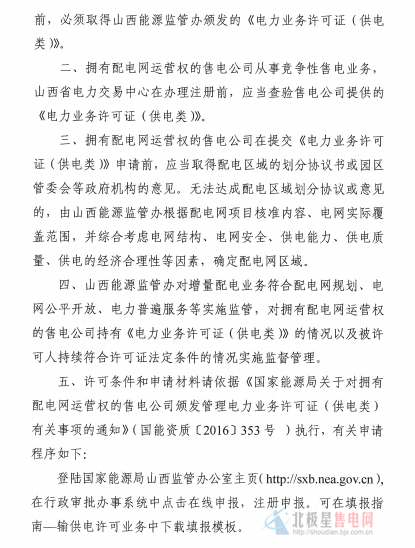 山西能源監(jiān)管辦關(guān)于擁有配電網(wǎng)運(yùn)營權(quán)的售電公司申請《電力業(yè)務(wù)許可證(供電類)》的通知近日發(fā)布,一起來看通知全文: