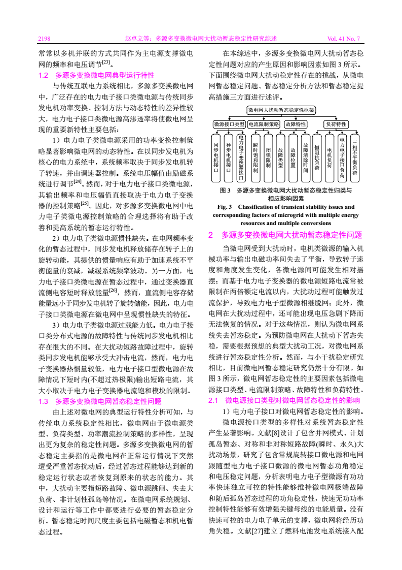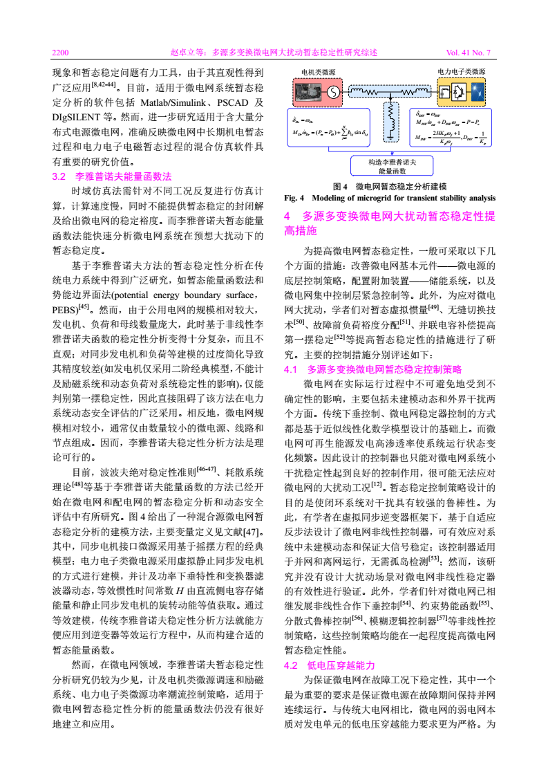 摘要:多源多變換微電網(wǎng)整合中低壓配電網(wǎng)中特性各異的分布式發(fā)電系統(tǒng)和負(fù)荷,多類(lèi)型微電源、多類(lèi)型負(fù)荷動(dòng)態(tài)特性相互耦合、互相影響,傳統(tǒng)以交流同步發(fā)電機(jī)供電電源為基礎(chǔ)的系統(tǒng)穩(wěn)定分析與控制方法無(wú)法滿(mǎn)足多源多變換微電網(wǎng)大規(guī)模發(fā)展的要求。首先對(duì)近年來(lái)國(guó)內(nèi)外多源多變換微電網(wǎng)大擾動(dòng)暫態(tài)穩(wěn)定性的研究進(jìn)行評(píng)述,歸納總結(jié)可再生能源滲透率不斷提升下微電網(wǎng)典型運(yùn)行特性和存在的暫態(tài)穩(wěn)定性問(wèn)題。在微電網(wǎng)暫態(tài)穩(wěn)定性分類(lèi)的基礎(chǔ)上,分別從微電網(wǎng)暫態(tài)穩(wěn)定問(wèn)題、暫態(tài)穩(wěn)定分析方法和微電網(wǎng)暫態(tài)穩(wěn)定性提高措施三方面對(duì)微電網(wǎng)暫態(tài)穩(wěn)定性的研究動(dòng)態(tài)進(jìn)行分析、評(píng)價(jià)和探討;最后,預(yù)測(cè)和探討了微電網(wǎng)大擾動(dòng)暫態(tài)穩(wěn)定性研究的發(fā)展趨勢(shì)。