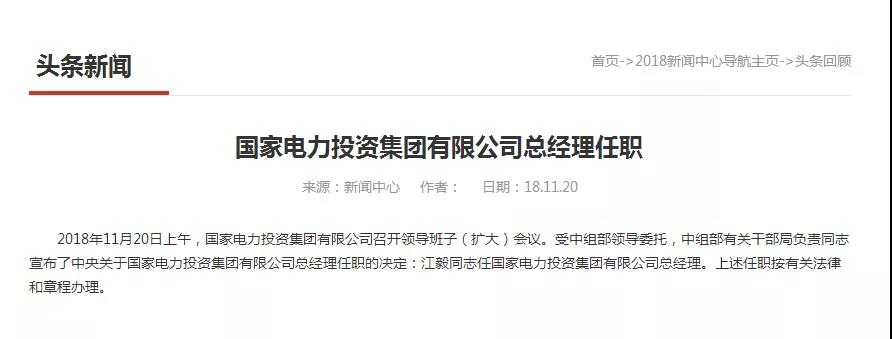 據(jù)國家電投官網(wǎng)消息,2018年11月20日上午,國家電投召開領(lǐng)導(dǎo)班子(擴(kuò)大)會(huì)議,江毅任國家電投總經(jīng)理。國家電投原總經(jīng)理孟振平于2018年8月21日調(diào)往南方電網(wǎng)任董事長、黨組書記,因此,國家電投總經(jīng)理之位出現(xiàn)了三個(gè)月的空缺。