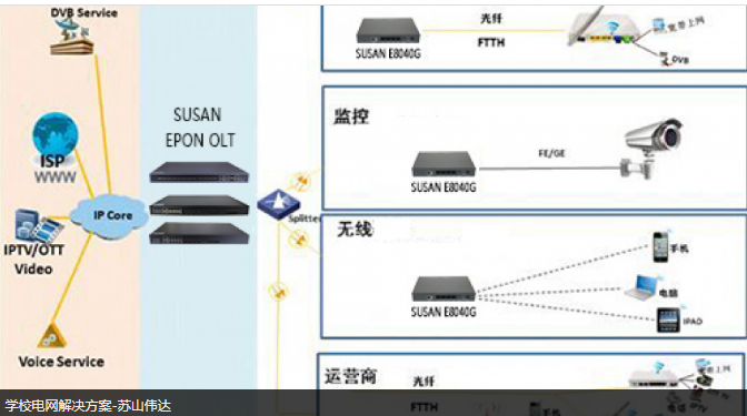學(xué)?;A(chǔ)網(wǎng)絡(luò)建設(shè)包括學(xué)校的監(jiān)控系統(tǒng)、廣播系統(tǒng),無(wú)線WIFI覆蓋,蘇山偉達(dá)公司主要采用PON(無(wú)源光網(wǎng)絡(luò))接入解決方案。
