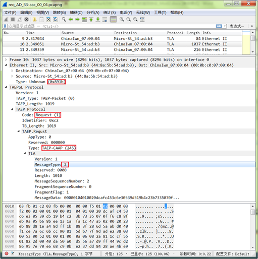 如圖10所示,當(dāng)前數(shù)據(jù)Code=1(Request),Type=245(TAEP-CAAP),MessageType=2(接入鑒別請求分組)。MessageData中包括如表3數(shù)據(jù)元素: