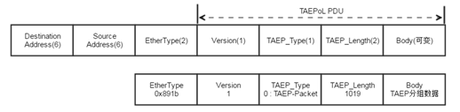 圖6幀結(jié)構(gòu)中Body部分,根據(jù)TAEP_Type字段值可知為TAEP(TAEP over Link,基于鏈路的三元鑒別可擴(kuò)展協(xié)議)分組。TAEP分組幀結(jié)構(gòu)如圖7所示。