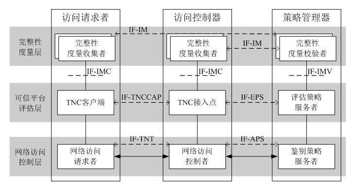 網(wǎng)絡(luò)訪問層(Network Access Layer)、可信平臺評估層(Trusted Platform Evaluation Layer)和完整性度量層(Integrity Measurement Layer)。涉及用戶鑒別和平臺鑒別兩個核心機制,其中AR和AC都具有可信平臺控制模塊(TPCM,Trusted Platform Control Module),支持AR和AC之間的雙向平臺鑒別,AC參與身份鑒別和平臺鑒別協(xié)議處理,同時架構(gòu)也對用戶鑒別與平臺鑒別進行了綁定處理,提供了原子性安全。
