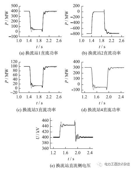 圖5 階躍響應(yīng)各換流站直流功率和直流電壓波形
