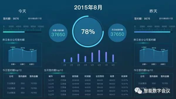 如下圖所示銷售駕駛艙大屏,頂部的標(biāo)題通過左右兩個對稱線條進(jìn)行點(diǎn)綴,各個組件的細(xì)分標(biāo)題通過不規(guī)則漸變色圖片進(jìn)行點(diǎn)綴,另外每個組件都搭配使用了簡潔的邊框以提升層次感。