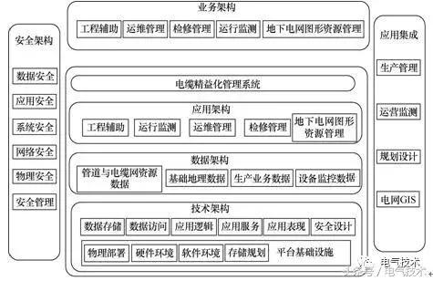 通過與北京電網(wǎng)GIS平臺進(jìn)行服務(wù)調(diào)用數(shù)據(jù)交換完成管道及電纜空間數(shù)據(jù)的共享與交換。電纜精益化管理系統(tǒng)的總體架構(gòu)由業(yè)務(wù)架構(gòu)、應(yīng)用架據(jù)、技術(shù)架構(gòu)、物理架構(gòu)、安全架構(gòu)和應(yīng)用集成等部分組成。系統(tǒng)總體架構(gòu)如圖1所示。