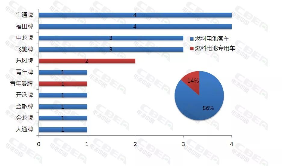 圖1:2017年新能源汽車推薦目錄中各品牌燃料電池車獲批車型量及類型占比