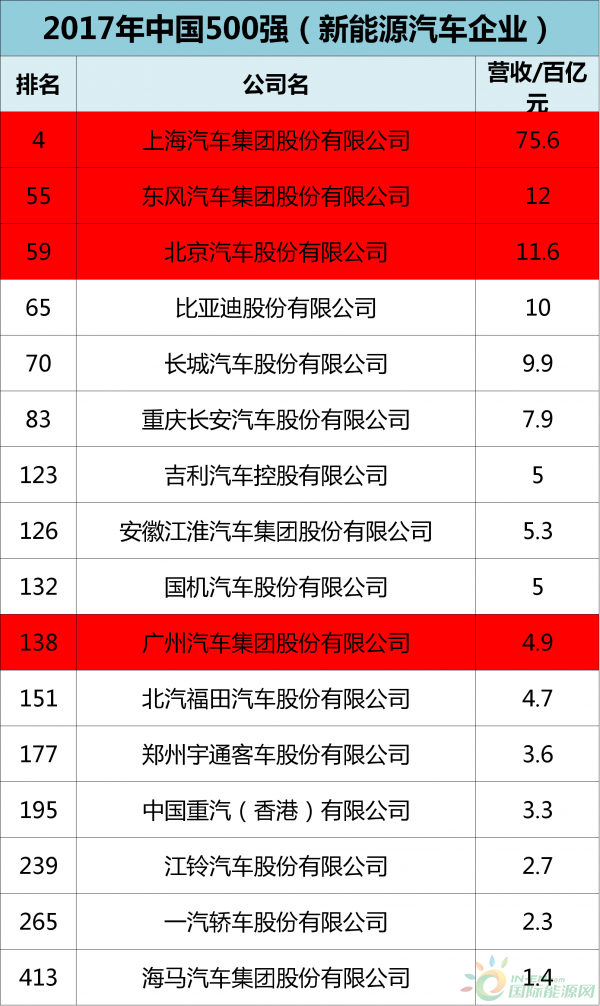 前不久,財(cái)富中文網(wǎng)發(fā)布了世界和中國500強(qiáng)企業(yè)排行榜,在世界500強(qiáng)中,新能源車企占到16家,其中有5家為中國車企,分別是:上海汽車集團(tuán)股份有限公司、東風(fēng)汽車公司、中國第一汽車集團(tuán)公司、北京汽車集團(tuán)和廣州汽車工業(yè)集團(tuán),五家車企中,入圍的中國新能源車企中,上汽集團(tuán)在世界500強(qiáng)中排到了41名,位居中國新能源車企榜首。