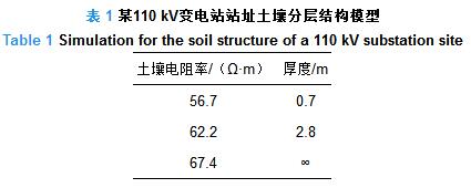 110-A2-X1典型設(shè)計(jì)方案采用全戶內(nèi)布置,主變、電容器、配電裝置、二次設(shè)備等均布置在“一”字配電裝置樓內(nèi),配電裝置樓四周環(huán)繞4 m寬的站內(nèi)人行道,站內(nèi)右側(cè)有消防泵房、消防水池等建筑。圍墻內(nèi)占地面積2 774 m2。其中,配電裝置樓為地上2層建筑。變電站遠(yuǎn)景規(guī)劃3臺(tái)主變壓器。110 kV側(cè)6回全電纜出線,短路電流水平為40 kA;10 kV側(cè)42回全電纜出線,短路電流水平25 kA。全電纜出線使分流系數(shù)大大降低,考慮最嚴(yán)重情況,選擇分流系數(shù)為36%,則入地故障電流為25.6 kA,故障電流水平較高。主接地網(wǎng)采用不等距網(wǎng)格布置,水平接地網(wǎng)采用截面為120 mm2的銅絞線,垂直接地體選用直徑14.2 mm的銅覆鋼接地棒。某110 kV全戶內(nèi)變電站土壤模型如表1所示。