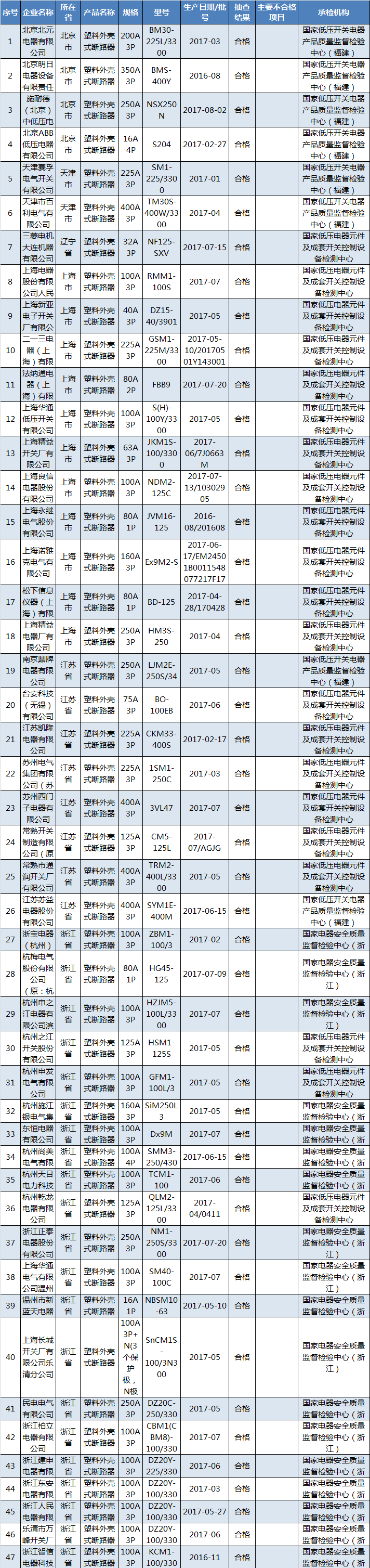 塑料外殼式斷路器產(chǎn)品質(zhì)量國(guó)家監(jiān)督抽查產(chǎn)品及其企業(yè)名單